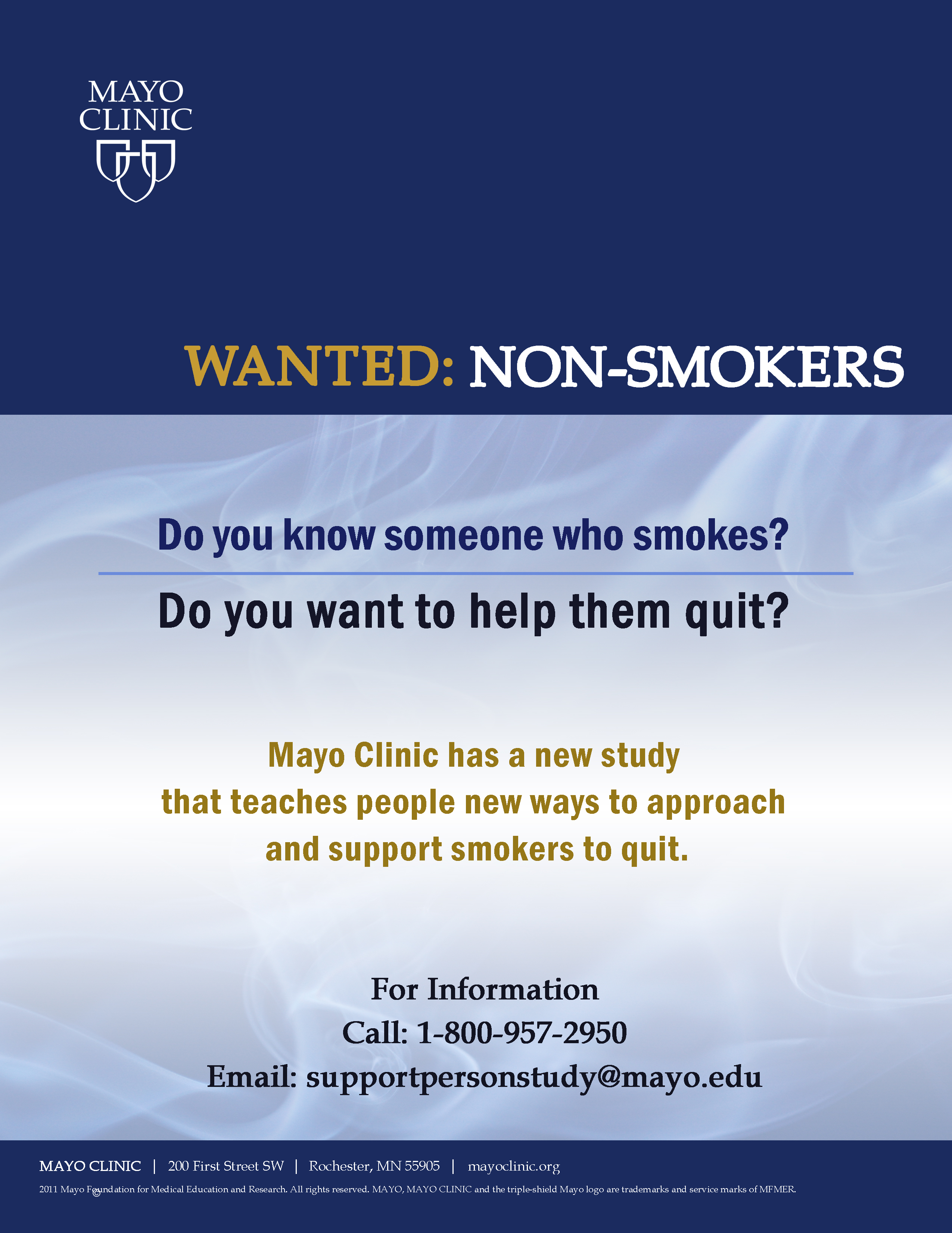 Mayo Clinic and ClearWay Minnesota are conducting a study to learn the effectiveness of a telephone-based program to support persons who are worried about a cigarette smoker. The program teaches nonsmokers new ways to approach and support smokers to quit. The program is conveniently provided by phone and mail. The smoker can receive free quitline services, which include a personalized quit program, coaching over the phone, and free nicotine patches, lozenges or gum. Support persons will also receive a gift for their participation. Healthcare providers and tobacco control professionals in Minnesota can share information about this study by distributing the study recruitment flyer and referring individuals who are interested in participating in the study. This free program is open to all nonsmoking Minnesota residents, ages 18 and older. Click here for more information. Call 1-800-957-2950 or email the study staff to learn more.